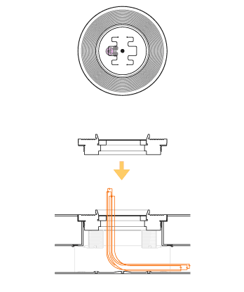 Accesorio de salida de cables con la boca del Nodo protegida al agua por resalto y con membrana antipolvo.Consiste en una tapa enrasada con el pavimento y dotada de una abertura menor central y sobreelevada para formar un dique frente a entrada de agua somera, más un tapón de cierre antipolvo que permite el paso de cables a través de discretas ranuras. |